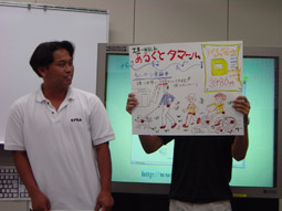 当日は、千早赤阪村の小中学校の先生方に多数お集まりいただき、「環境にやさしいエコグッズ」をテーマに、新しい商品の開発やプレゼンテーション、簡単なHP作りを体験していただきました。