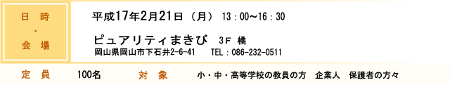 | 鹿嶋 研之助氏(千葉商科大学 教授) 片山 真一朗氏(児島青年会議所 直前理事長) 高橋 武彦氏(岡山県早期起業家教育研究会 会長) 滝澤 輝治氏(特定非営利活動法人ビジネスインキュベータ岡山 専務理事) 平井 由紀子氏(株式会社セルフウィング 代表取締役) 【コーディネータ】 原田紀久子氏(特定非営利活動法人アントレプレナーシップ開発センター 事務局長) |