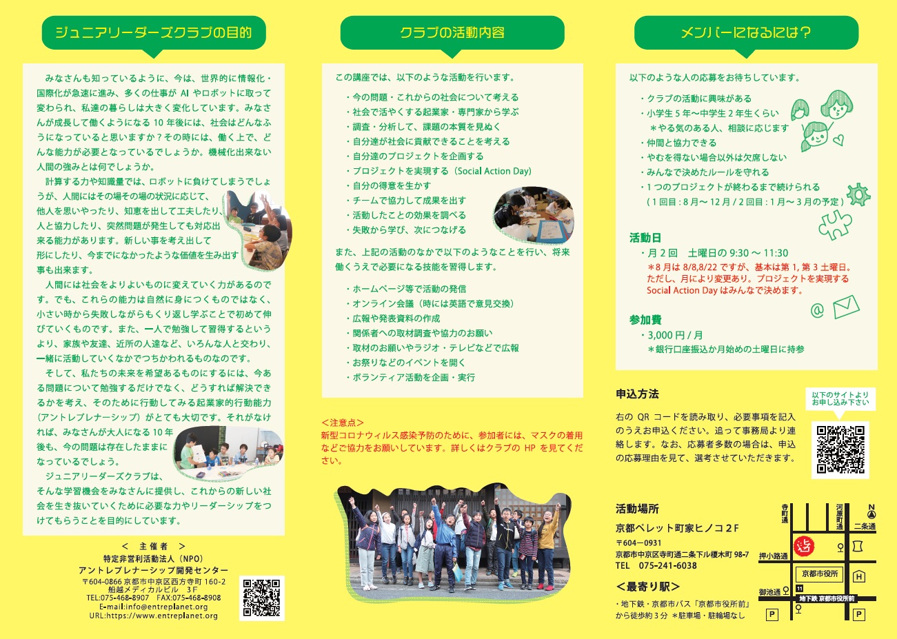 本事業は、これからの新しい社会を生き抜いていくために不可欠なアントレプレナーシップあふれるリーダーを育成するために実施するものです。ジュニアリーダーズクラブでは、子供達が実際に身近な社会問題について考え、専門家等から学びながら、その解決方法を考え、自分達でもできることを仲間と協力しながら、実際に取り組むことで、コミュニティや社会の一員として社会貢献することの意義や責任を学び、リーダーとしての素養を培います。自ら考え、工夫をし、新しいことを形にしてく、ロボットやAIに置き換えられない、そんな能力をつけてもらいたいと考えています。