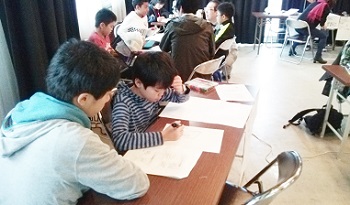「子どもの起業村」運営会議 当日の役割分担や準備物などを確認し、仕事に必要なものやそれぞれの会社(ベンチャー)でどんな人が従業員で必要かを考えました。その上で、当日参加して働く人を集める方法を考え、募集案内や参加者の公募チラシを作成しました。